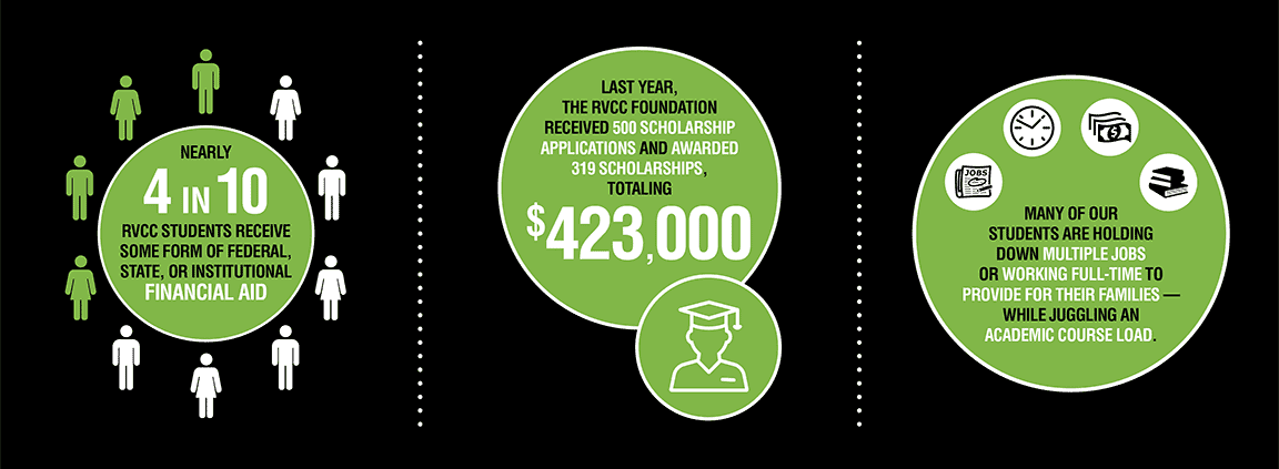 RVCC is committed to making higher education affordable for every student, but even RVCC’s modest tuition and fees present obstacles for many. The cost of modest tuition presents many RVCC students with the inability to meet the basic expenses of life: transportation, food, housing, etc. Now more than ever, your support can have a dramatic impact. Consider this:
